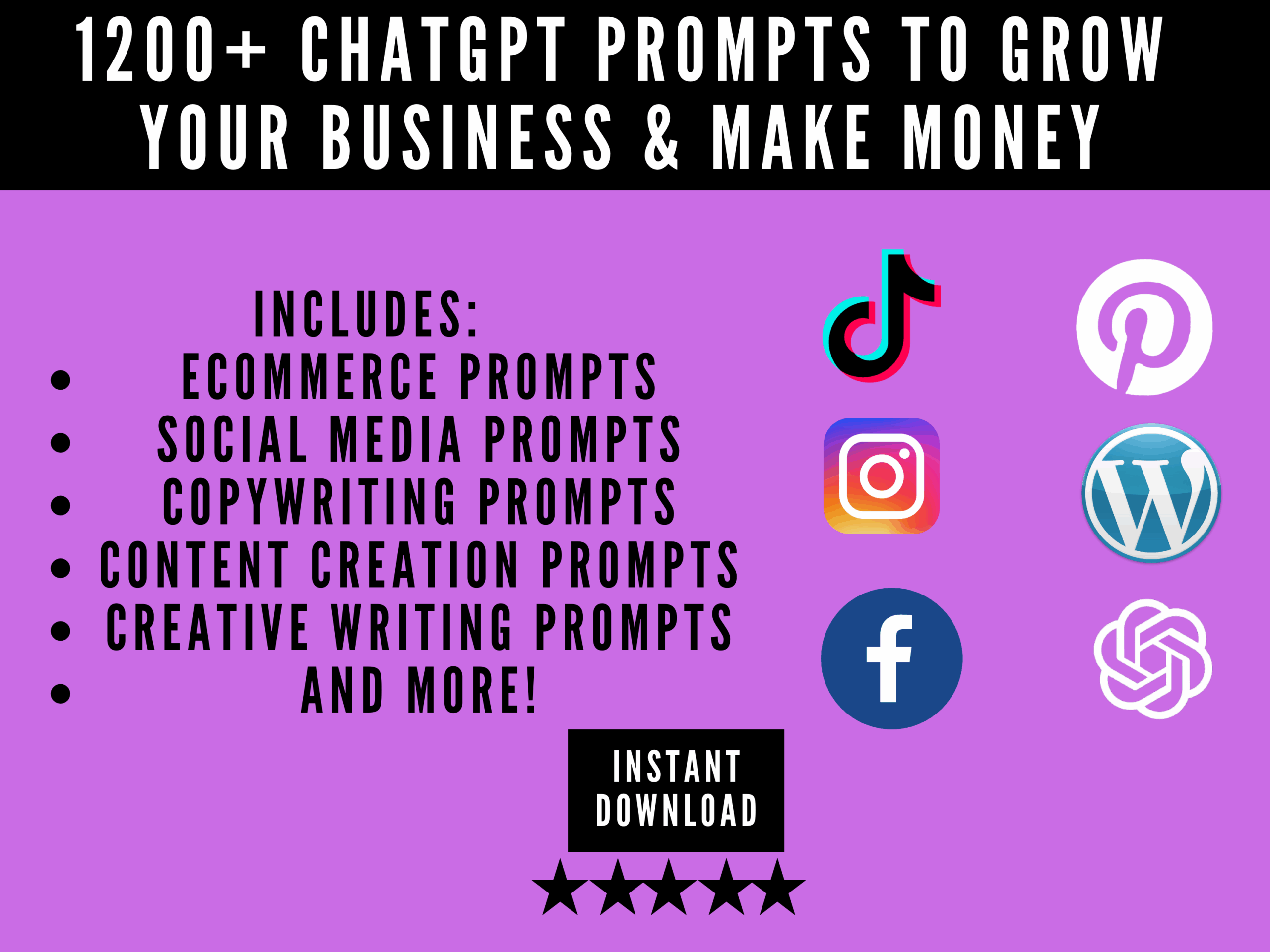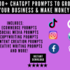 - 1200 ChatGPT Prompts: Access a curated collection of over 1200 prompts tailored for content creators and business owners. From generating viral video ideas to writing catchy captions and developing your brand voice, these prompts will help you save time and get creative effortlessly.